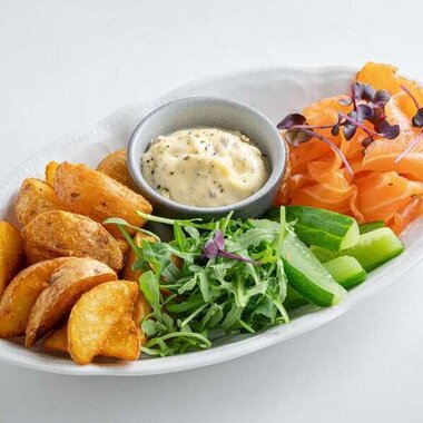 Лосось слабой соли с картофелем айдахо и домашними огурцами