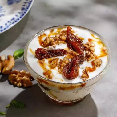 Мацони с медом и грецким орехом и курагой