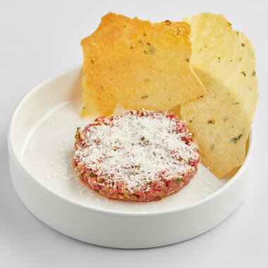 Тартар из говядины с овечьим сыром и хрустящей картофельное лепешкой