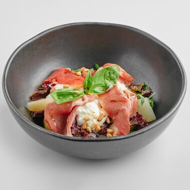 Салат с маринованной грушей, сыровяленым окороком и сыром страчателла